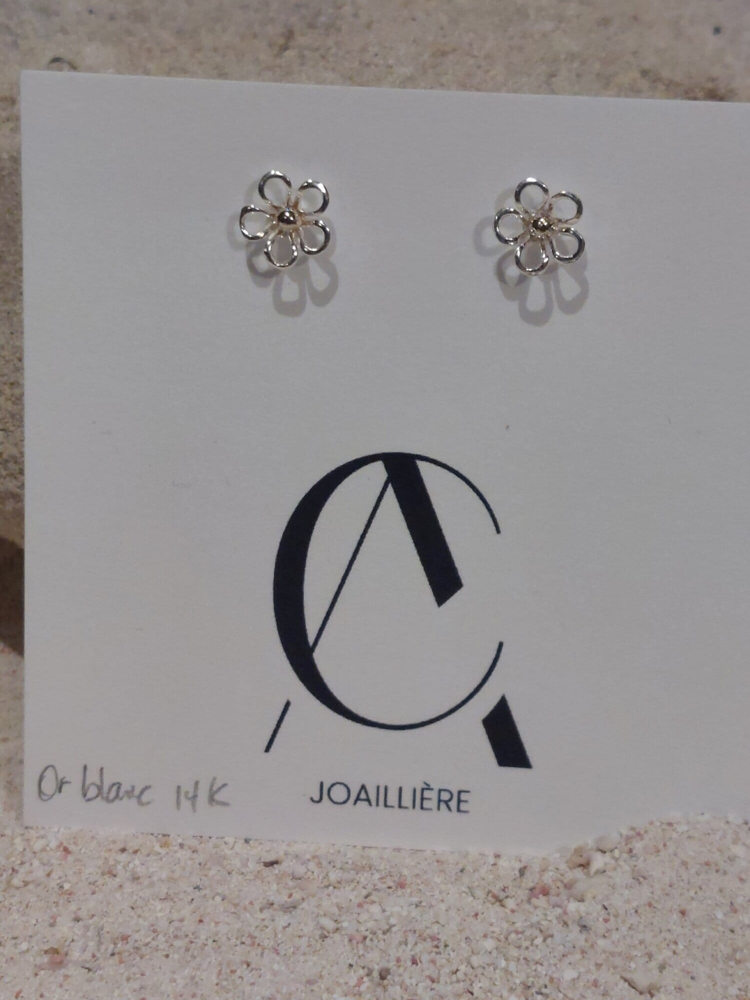 Boucles d’oreilles minimalistes et délicates en forme de marguerite sauvage. La coupole est faite d’argent 925 au fini poli alors que le centre, la tige et le papillon sont faits d’or 14K blanc.