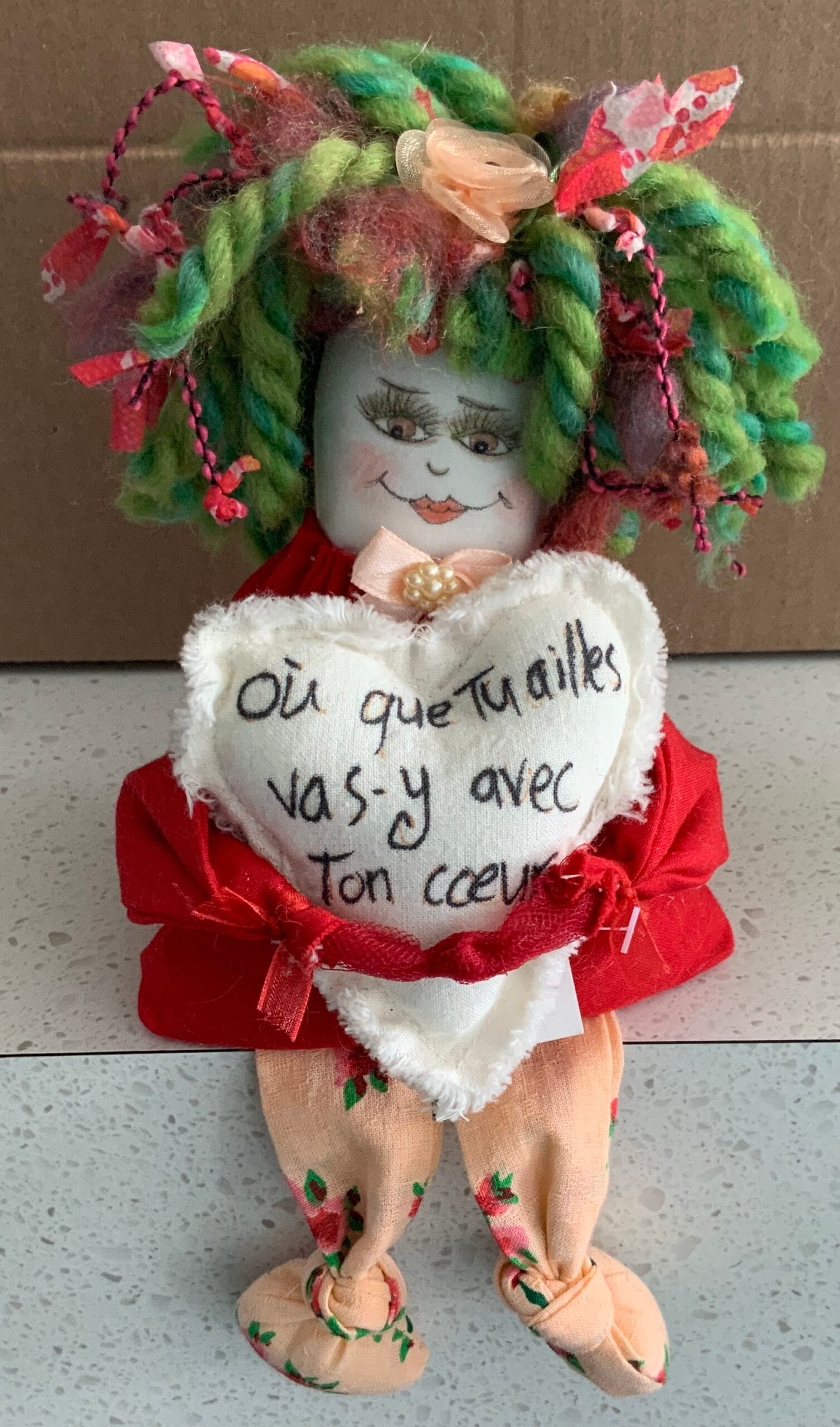 Poupée 9” de hauteur (des pieds jusqu’au dessus de la tête). Le corps est rembourré avec du riz pour une tenue assise plus ferme. Elle sera jolie dans n’importe quel pièce de la maison et avec son petit air espiègle cette poupée sera un bel atout dans votre décor.